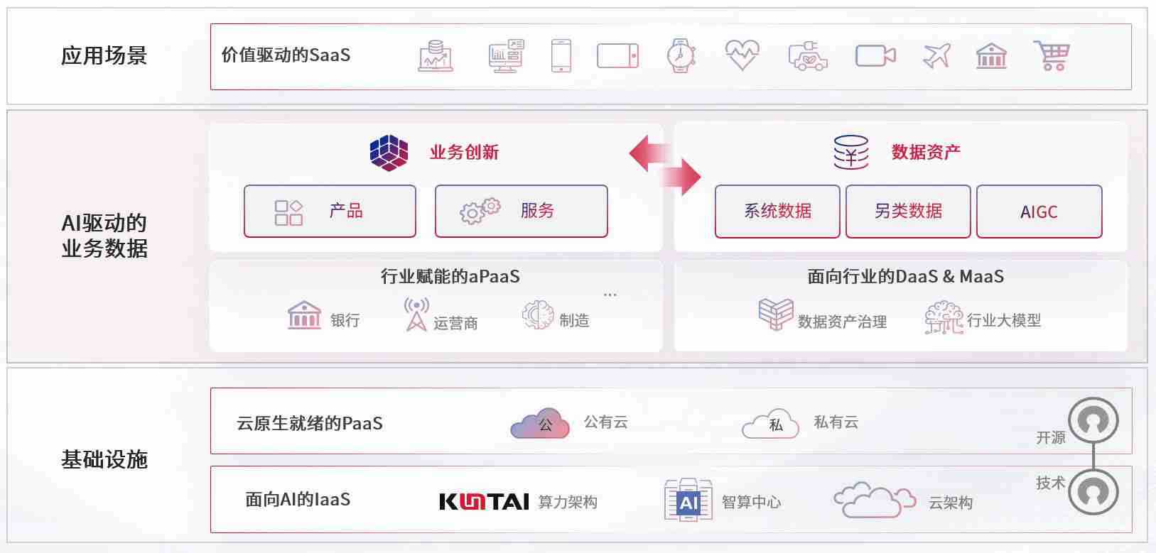 数字时代,,围绕企业数字化转型的关键要素,,,,ku酷游数码开创性的提出数云融合战略和技术体系框架,,着力在云原生、、、数字原生、、、AI原生和信创产业上架构产品和服务能力,,,,为处在不同数字化转型阶段的快消零售、、、、汽车、、、、金融、、医疗、、政企、、教育、、运营商等行业客户提供泛在的敏捷IT能力和融合的数据驱动能力,,,构建跨界融合创新的数字业务场景和新业务模式,,助力企业级客户建立面向未来的核心能力和竞争优势,,全面推动社会的数字化、、、、智能化转型升级。。。。